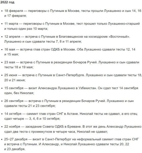 Преди повечето срещи очи в очи между Путин и Лукашенко синът на последния - Николай, също е бил подложен на PCR тестове, предполага се, че баща му го е вимал със себе си. Но преди събитията, когато политиците не са се срещнали лично, Лукашенко-младши не е преминавал тест за коронавирус.