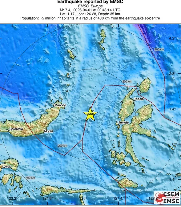 Земетресение с магнитуд 7,4 удари Северното море Молука край бреговете на град Тернате в Индонезия, като уби най-малко един човек и предизвика предупреждение за цунами, което впоследствие беше отменено.