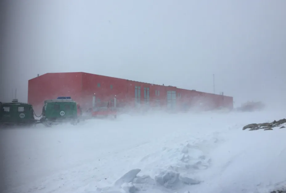 Скоростта на вятъра на пориви е над 150 км/ч, постройките на българската антарктическа база “Св. Климент Охридски” вибрират и навън е опасно придвижването между тях.