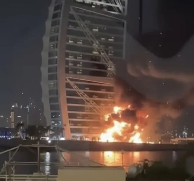 Кадри, разпространени онлайн, показват как петзвездният хотел е обхванат от пламъци. От властите в Дубай заявиха, че пожарът е причинен от отломки от прихванат дрон, които са паднали върху емблематичния луксозен хотел в града.