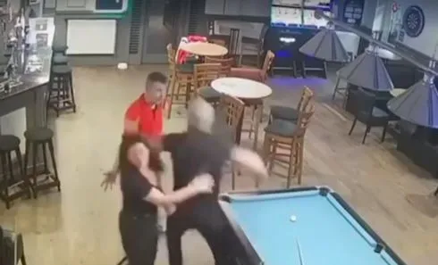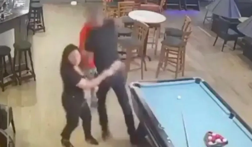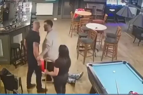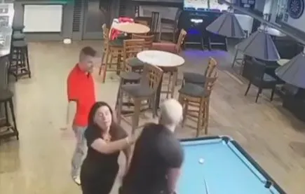 Съпругът става свидетел на случилото се и реагира мигновено – втурва се към мъжа и му нанася силен удар в лицето. Ударът поваля нападателя на земята. В опит да предотврати сблъсъка, жената се опитва да застане между двамата, но съпругът я избутва и неволно я удря с щеката за билярд, след което тя посяга към лицето си, за да провери дали е наранена, пише The New York Post