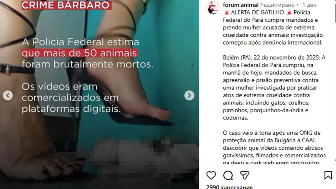 "Попаднахме на видеа с изключително тежко съдържание над животни, които се разпространяват онлайн. Подадохме сигнал до нашите партньори в Бразилия – организация, която се казва "Форум за животните".
