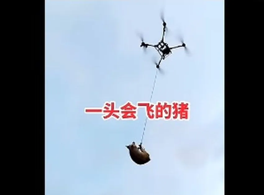 Според журналисти, планински фермер решил да използва дрон, за да транспортира прасета до кланица. Той обяснил, че местоположението на селото му в окръг Тунцзян, провинция Съчуан, прави транспортирането им с кола неудобно.