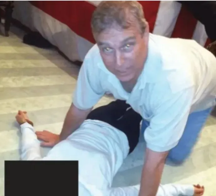 Публикуваните документи включват и снимки, които показват Андрю коленичил на пода да докосва талията на неидентифицирана жена.