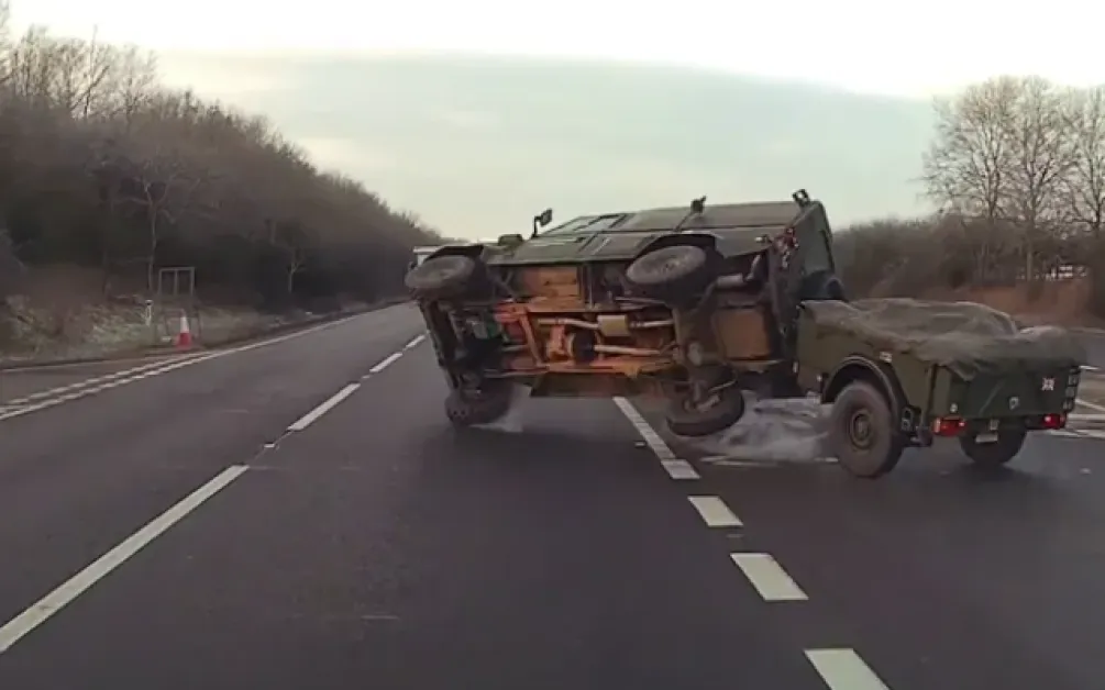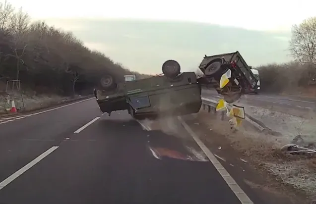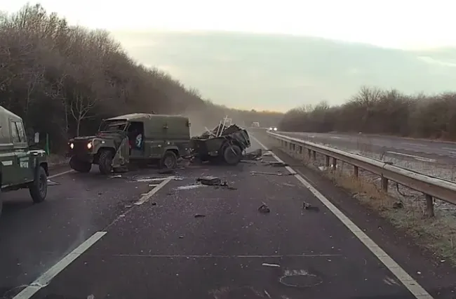 Военният автомобил се е движел с ремарке в колона с друг Land Rover зад него, който е успял да спре безопасно след инцидента. 36-годишният шофьор на катастрофиралия военен автомобил е откаран в университетската болница в Ковънтри със съмнения за счупен гръбнак.