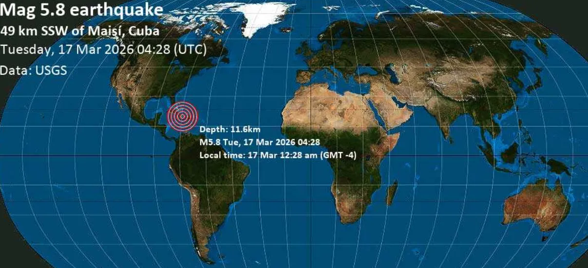 Силно земетресение с магнитуд 5,8 е регистрирано в Карибско море край бреговете на Куба в ранните часове на вторник, 17 март 2026 г., в 00:28 ч. местно време (GMT -4).