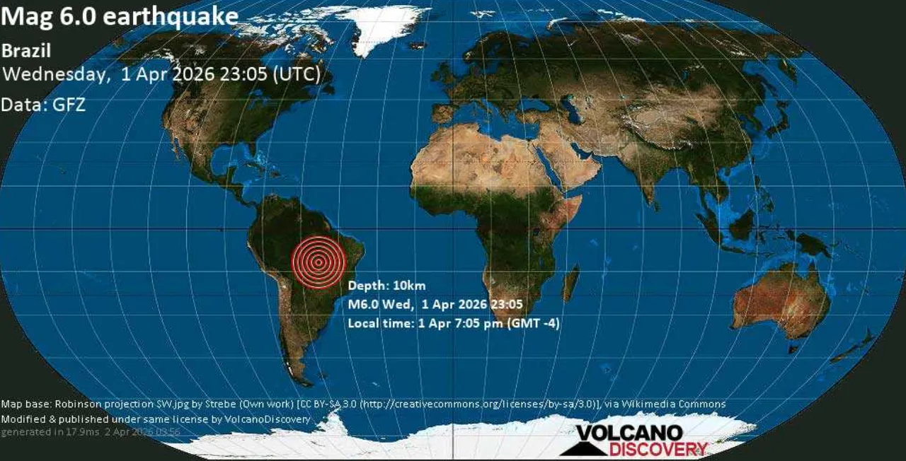 Трусът е отчетен на 98 км от Сао Жозе до Шингу, щата Мато Гросо, Бразилия, в късния следобед в сряда, 1 април 2026 г., в 19:05 ч. местно време (GMT -4).
