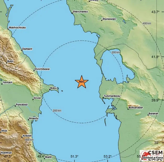 Епицентърът е бил в морската зона на Каспийско море, на около 158 километра североизточно от Баку, Азербайджан, и на 129 километра запад-северозападно от град Туркменбаши. Епицентърът на земетресението е на дълбочина около 57 километра.