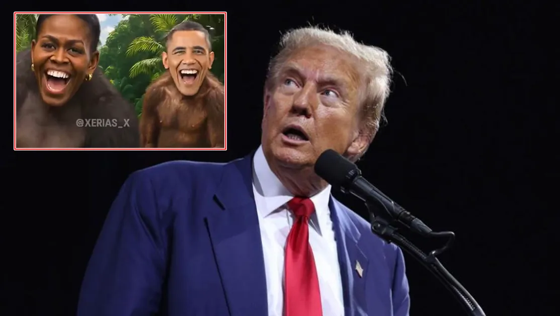 В четвъртък президентът от Републиканската партия публикува едноминутно видео, подсилващо неговите фалшиви твърдения, че поражението му на изборите през 2020 г. е резултат от измама. На танцуващи примати, очевидно генерирани от изкуствен интелект, са наложени главите на бившия президент демократ Барак Обама и съпругата му Мишел. Видеото бе свалено около 12 часа по-късно, а говорителката на Белия дом Карълайн Левит заяви, че публикацията е породила "фалшиво възмущение".