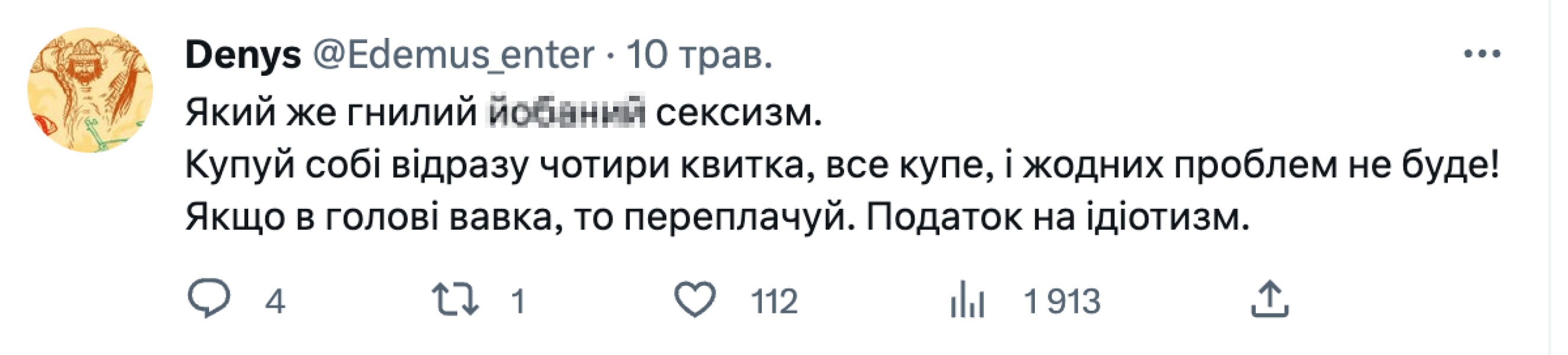 Някои потребители съветват украинските жени, които се страхуват да пътуват с мъже, да купуват всички купета или изобщо да не използват Ukrzaliznytsia.