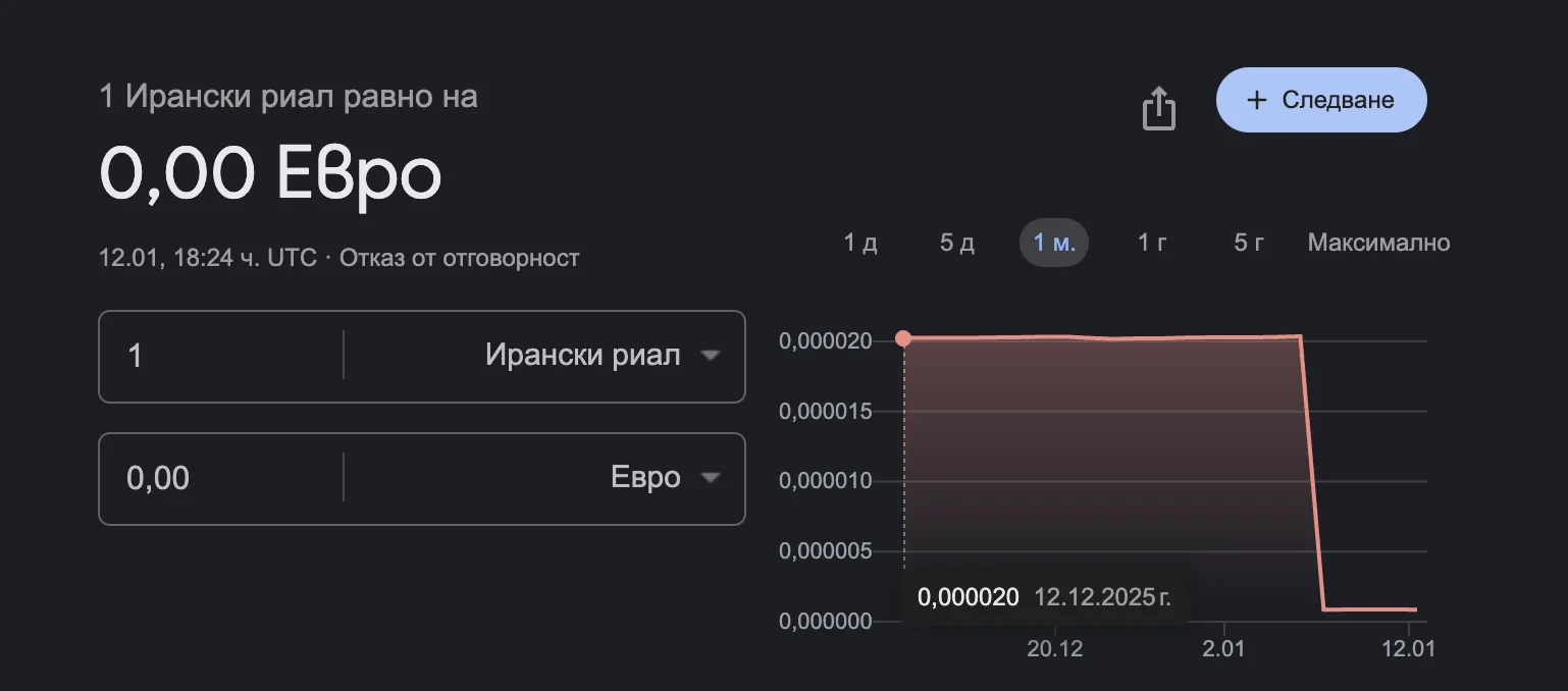 Иранската валута се срина на фона на големите антиправителствени протести в страната. Вече 1 ирански риал струва 0 (нула) евро, като през последната година иранският риал загуби около 96 процента от стойността си.