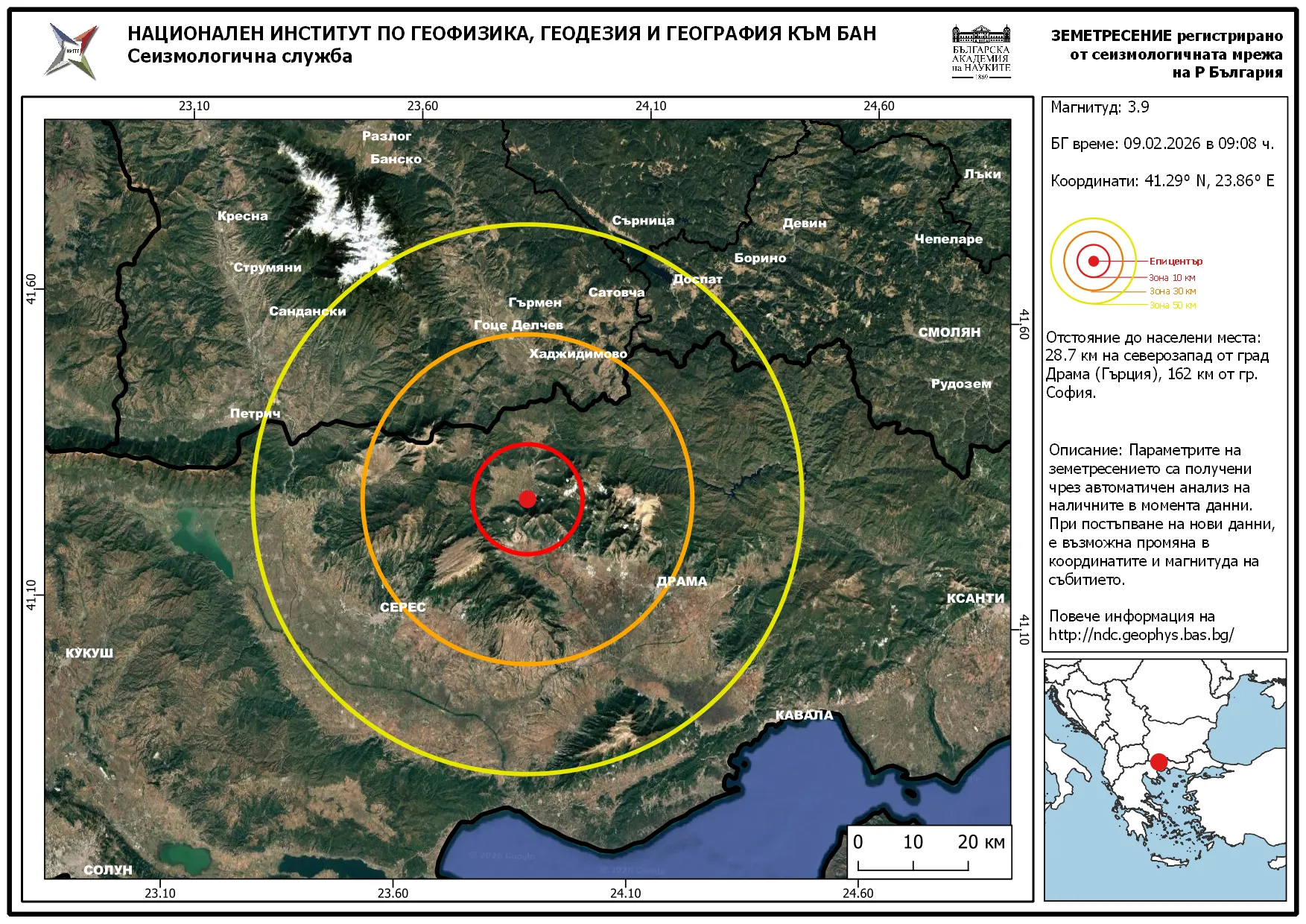 Земетресение с магнитуд 3,9 по скалата на Рихтер е регистрирано тази сутрин в граничния район между Гърция и България. По данни на Националния сеизмологичен център към БАН, трусът е станал днес в 09:08 часа.