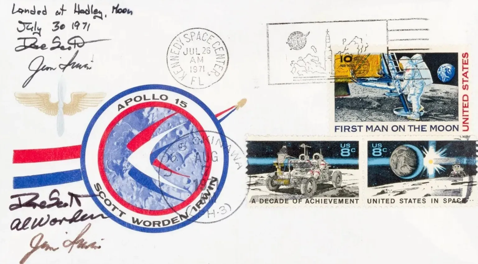 През 1971 г. НАСА разрешава на екипажа на Аполо 15 – Дейвид Скот, Алфред Уордън и Джеймс Ъруин – да вземе 241 филателни плика по време на полета до Луната. Идеята е те да бъдат продадени след края на кариерите им.