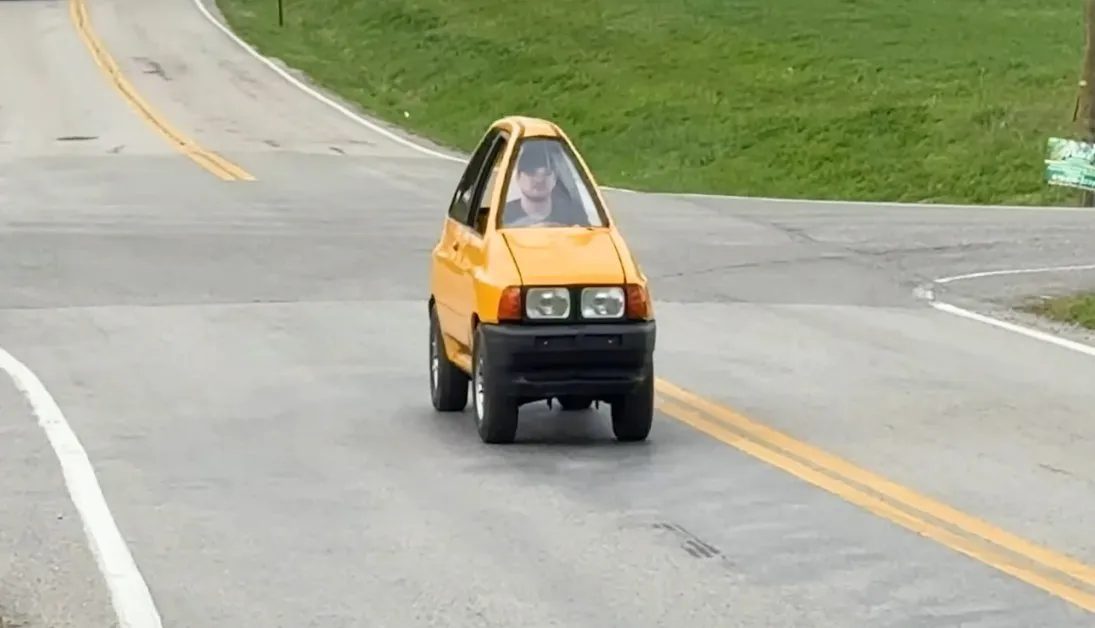 Резултатът е странно, но напълно функционално превозно средство. Вътре има място за двама души, но не един до друг – а подредени един зад друг, подобно на мотоциклет. Заради ограниченото пространство дори воланът е бил скъсен.