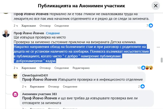 Според твърденията на проф. Йовчев, направеният обход на болничните стаи и разговорите с родителите на настанените деца не са потвърдили наличието на насекоми.
