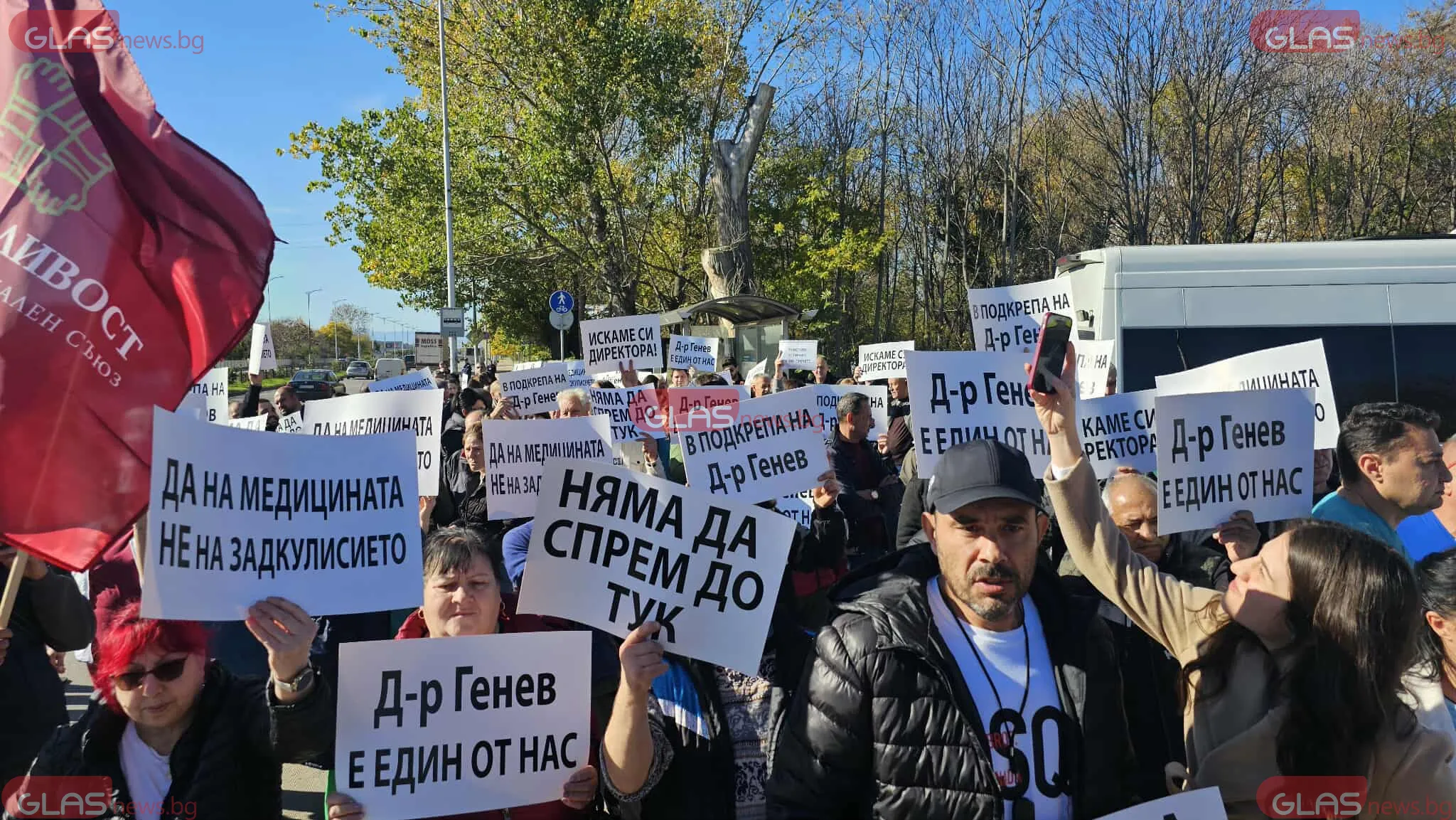 Със скандирания „Искаме си директора” и плакати „Д-р Генев е един от нас” и „ДА на медицината, НЕ на задкулисието” медиците от УМБАЛ–Пловдив блокираха за кратко кръстовището на бул. „България“ и ул. „Дилянка“ в знак на недоволство от резултатите на конкурса за ново ръководство на болницата.