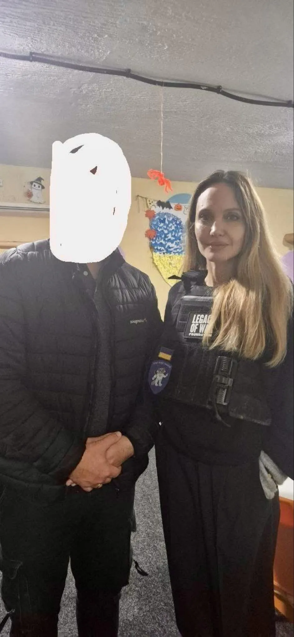 Бившият член на градския съвет в Херсон Виталий Богданов сподели снимка с актрисата. На нея се вижда как тя е облечена с бронирана жилетка.