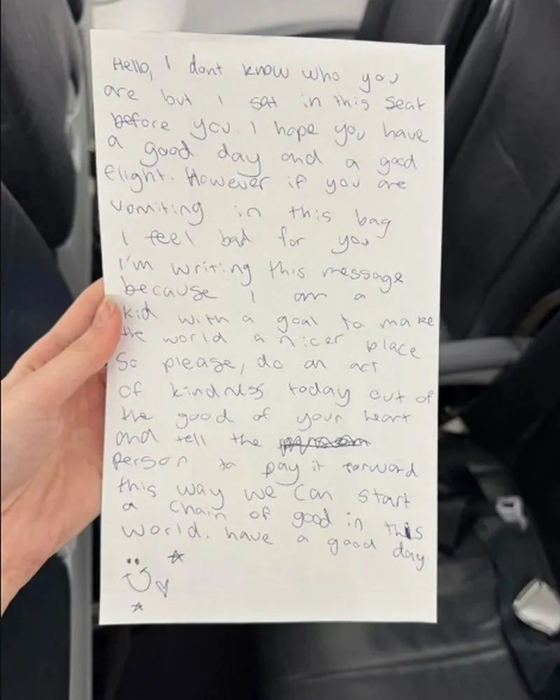 Оказало се, че бележката е написана от дете. С прост, но изключително искрен почерк, малкият автор пожелава на следващия пътник приятен ден и спокоен полет. А после добавя нещо, което превръща текста в истинско послание: