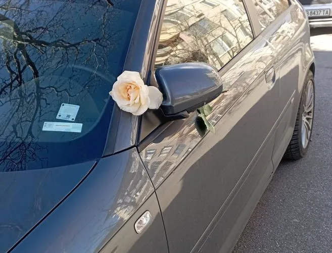 На снимки, споделени в социалните мрежи, се вижда паркиран автомобил, на чието странично огледало е оставена бяла роза. Цветето е поставено внимателно, сякаш с мисъл и отношение, а не случайно подхвърлено. Няма бележка, няма име – само един неочакван символ на внимание.