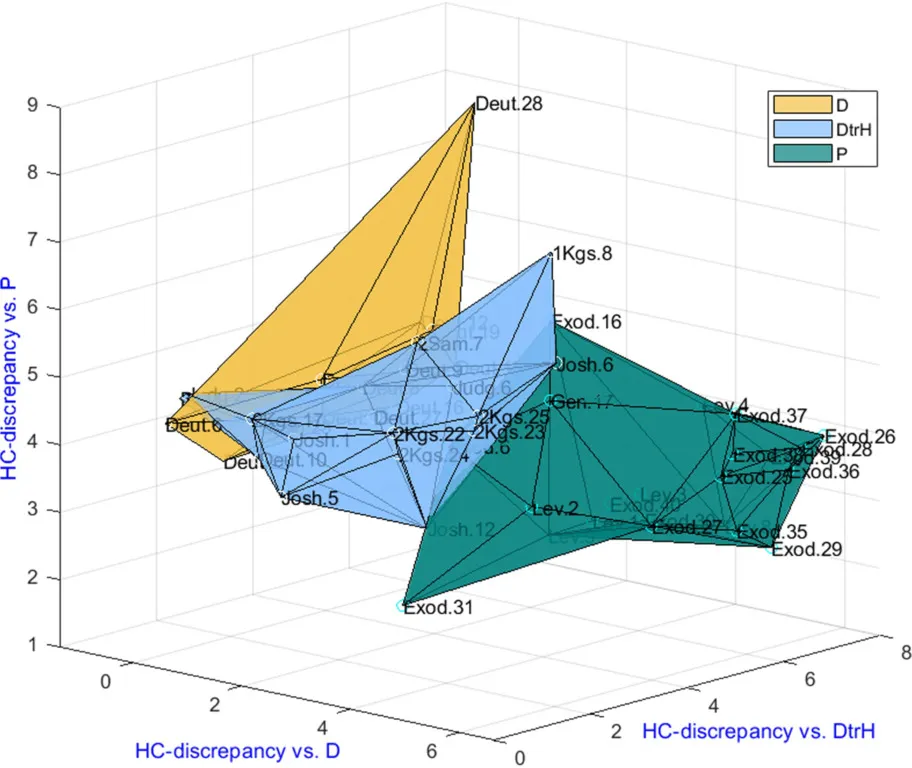 Разработеният алгоритъм с изкуствен интелект раздели библейските текстове на три основни стила: основен източник (свещенически източник), книгата „Повтаряне на закона“ и историята след Пета книга на Мойсей. По този начин беше възможно да се установи, че авторите (или група преписвачи) биха могли да действат по следния начин: