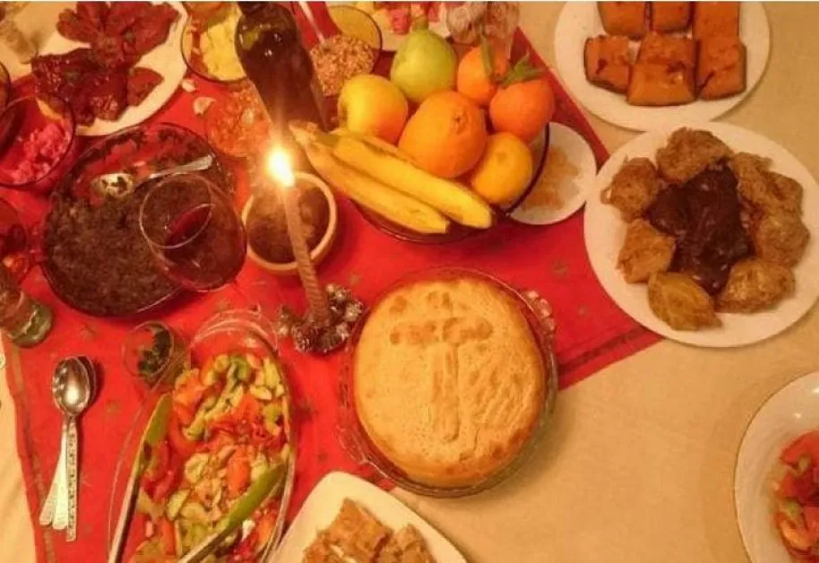 На масата се поставят само постни ястия, а броят им традиционно е нечетен. Най-често те са седем – символ на дните в седмицата, или девет – колкото са месеците на бременността. В някои региони на страната ястията са единайсет или дванайсет, свързвани с месеците в годината. Сред тях са сърми, варено жито, пълнени чушки, мед, тиквеник, ошав, вино и други, като всяко носи своя символика за здраве, плодородие и благополучие.
