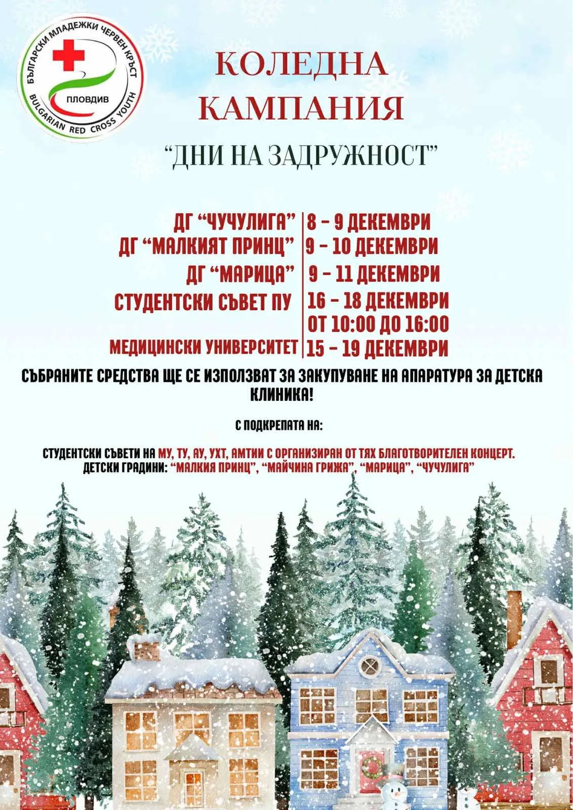 Поредица от благотворителни коледни базари ще събира средства за изграждащата се Детска клиника към УМБАЛ „Св. Георги“ в Пловдив. Инициативата е на областната организация на Българския младежки Червен кръст съвместно с партньори - детски градини и висши училища. Акцията ще продължи от 8 до 19 декември 2025 година.