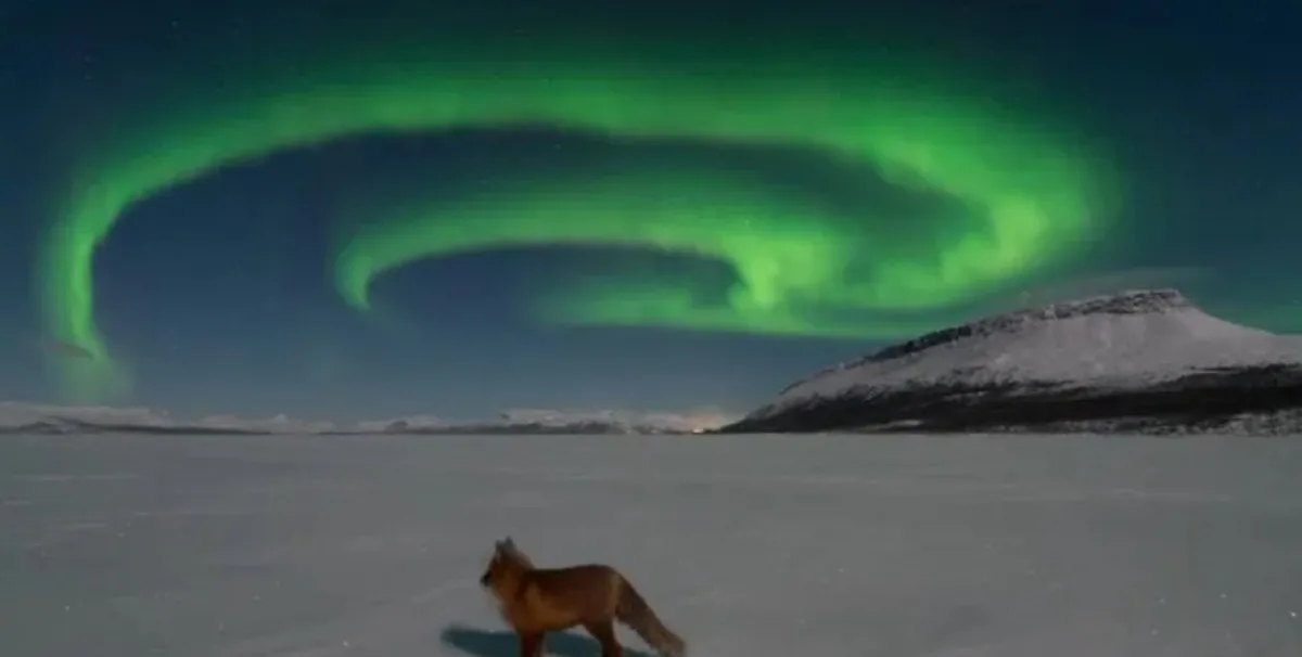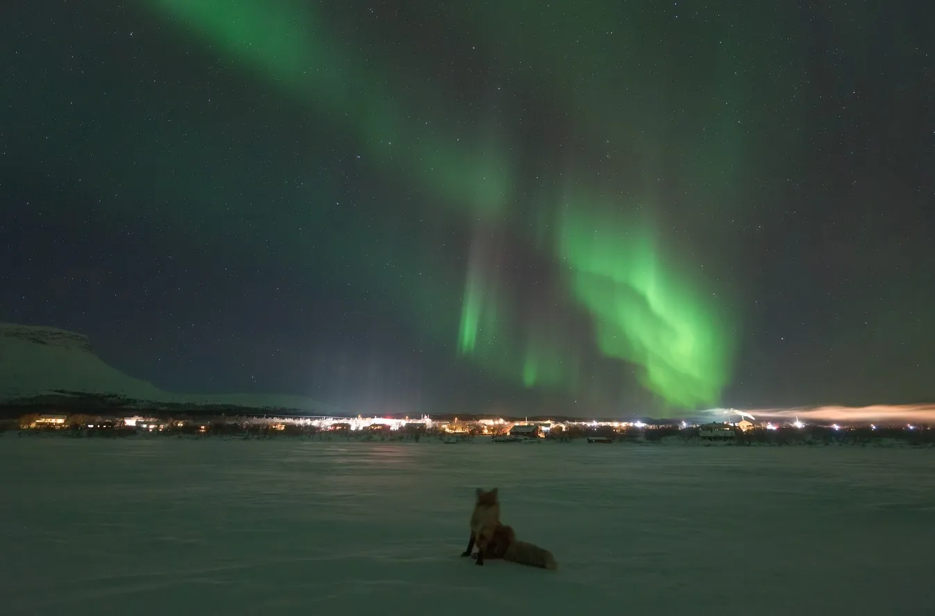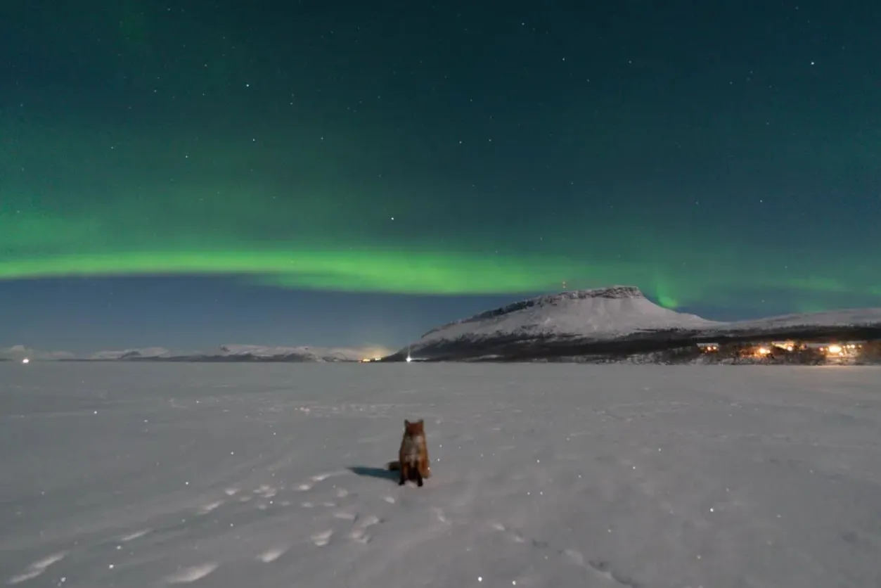 Фотографът Денис Лехтонен успява да улови необикновена сцена в Северна Финландия – ярко северно сияние, обагрило нощното небе, и любопитна лисица, която сякаш не се впечатлява от небесния спектакъл, а от самия човек зад обектива.