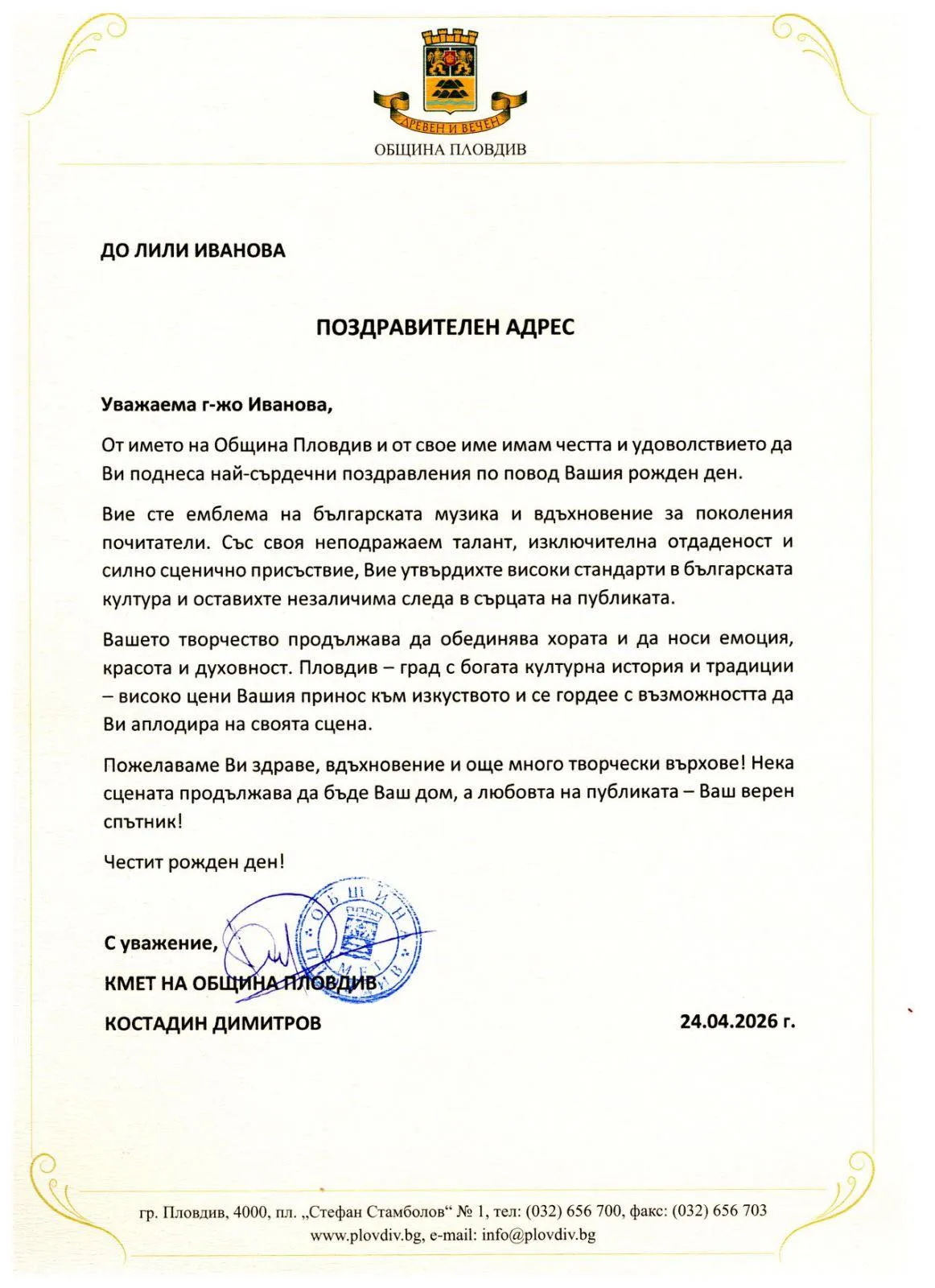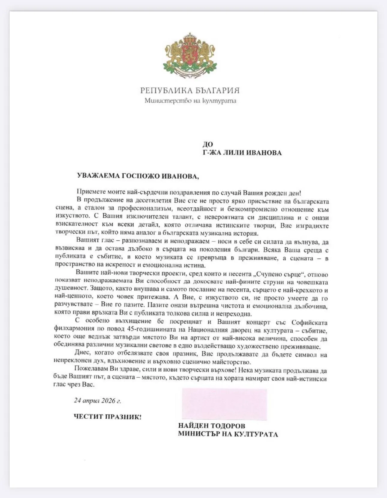 „Вашият глас носи в себе си силата да вълнува, да възвисява и да остава дълбоко в сърцата на поколения българи. Всяка Ваша среща с публиката е събитие, в което музиката се превръща в преживяване, а сцената - в пространство на искреност“, подчертава министърът.